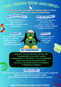 Si vous êtes intéressé par les logiciels libres, dont le système Linux, nous vous proposons de participer à une rencontre conviviale ouverte à tous, dans l’idée de constituer un groupe pour découvrir, échanger, bidouiller, créer… RDV le jeudi 3 juillet à partir de 17h30 à La Cyber de Mourenx. Soyez curieux, venez nous rendre visite.
