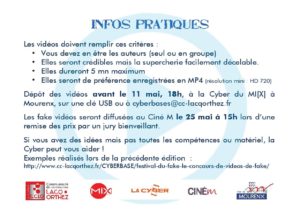 Dans le cadre du « Festival du Fake : Infox » organisé par la Mairie de Mourenx et qui se tiendra du 22 au 26 mai, la Cyber vous propose de participer au