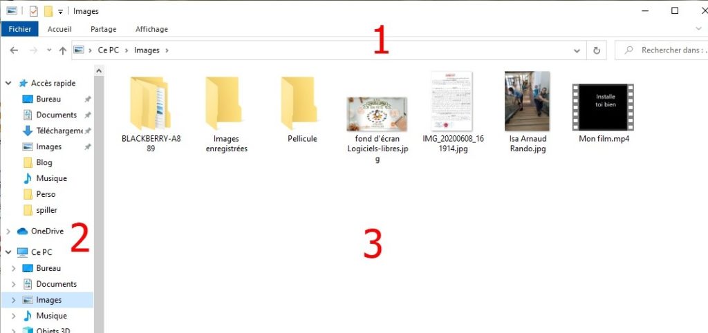 Quelque soit la version de Windows (10, 8, 7,…), l’explorateur de fichiers, anciennement appelé « Blibliothèque », est composé de 3 zones situées toujours aux mêmes emplacements :