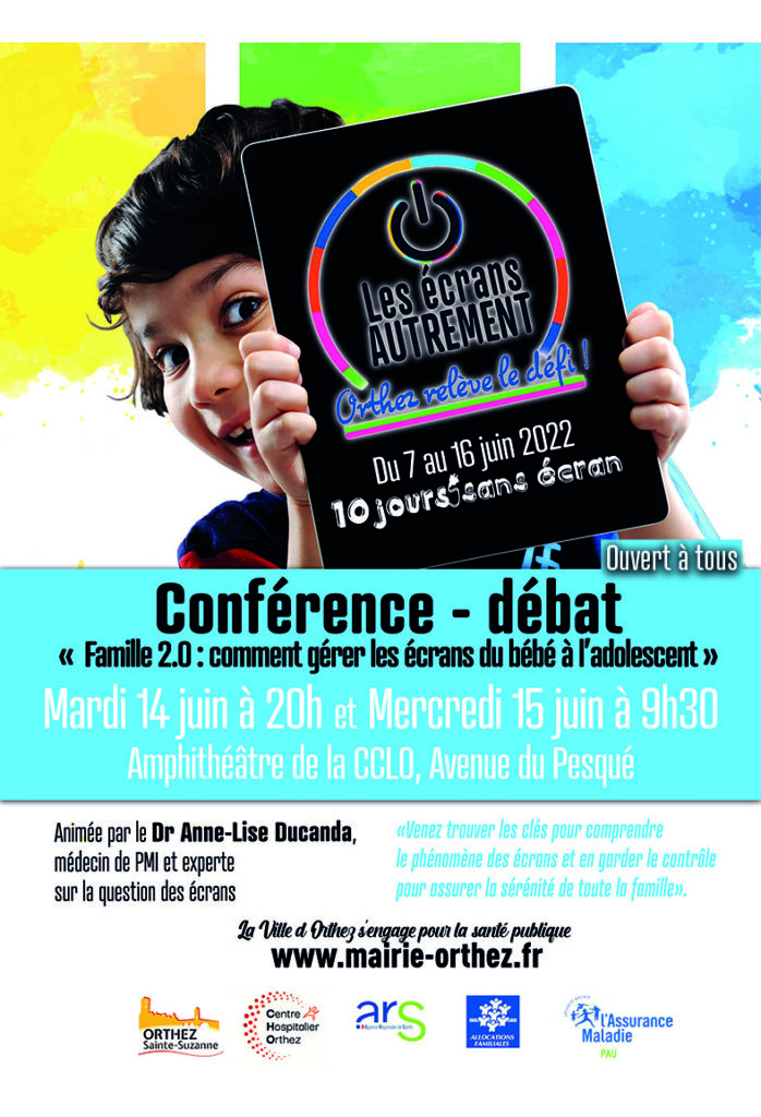 – mardi 14 juinà 20h et mercredi 15 juin à 9h30 à l’amphi de la CCLO (Av. du Pesqué Orthez) : Conférences avec le docteur Anne-Lise Ducanda « Famille 2.0 : comment gérer les écrans du bébé à l’adolescent ».