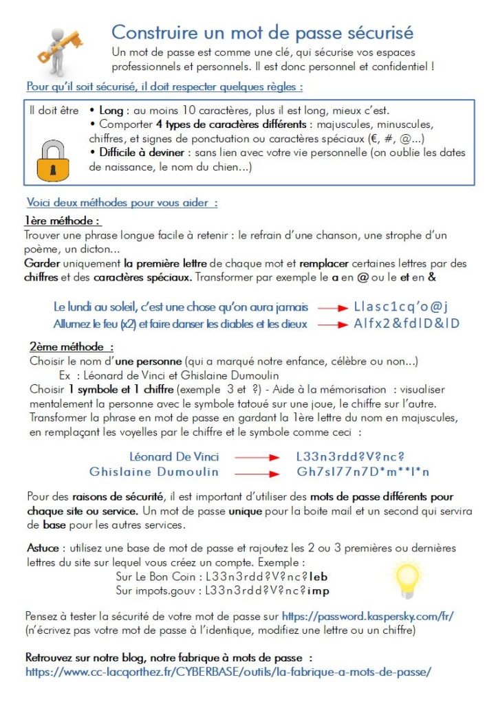 Afin de vous aider dans la création et la mémorisation de ces mots de passe, l’équipe du réseau Cyber-Base Lacq-Orthez vous propose ci-contre un document avec des conseils pour sécuriser l’ensemble de vos mots de passe et deux méthodes très simples pour créer et mémoriser facilement un nombre importants de mots de passe pourtant différents.