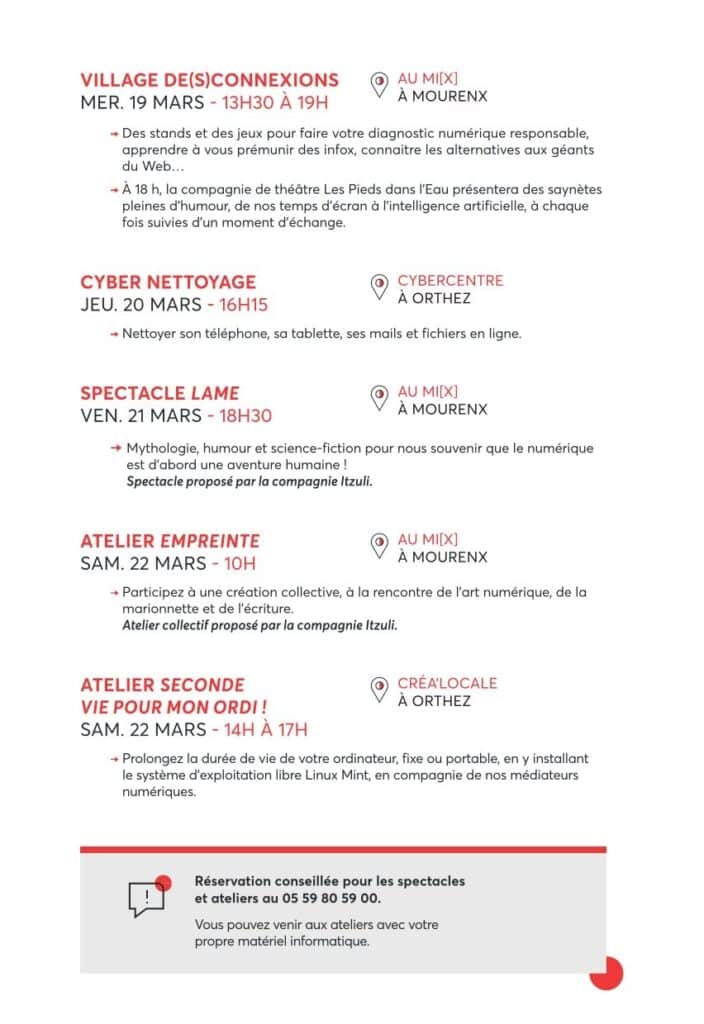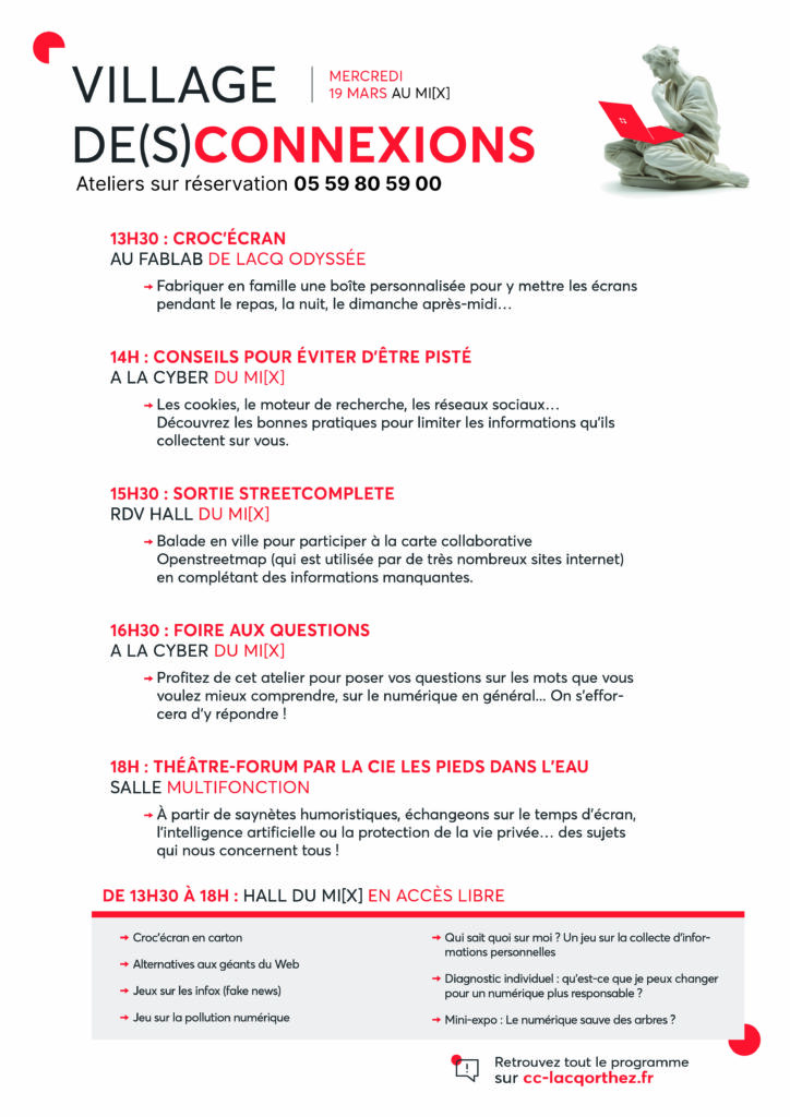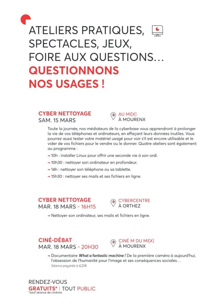 Le MI[X] et le CyberCentre vous proposent de questionner vos usages de diverses manières. Ainsi vous pourrez nettoyer votre ordinateur, téléphone ou tablette, installer Linux, participer à un ciné-débat, à des ateliers, des animations et spectacle… Pour découvrir le programme complet, veuillez le consulter ci-dessous. N’oubliez pas le Village De(s)Connexions le mercredi 19 mars (cliquez ici) !